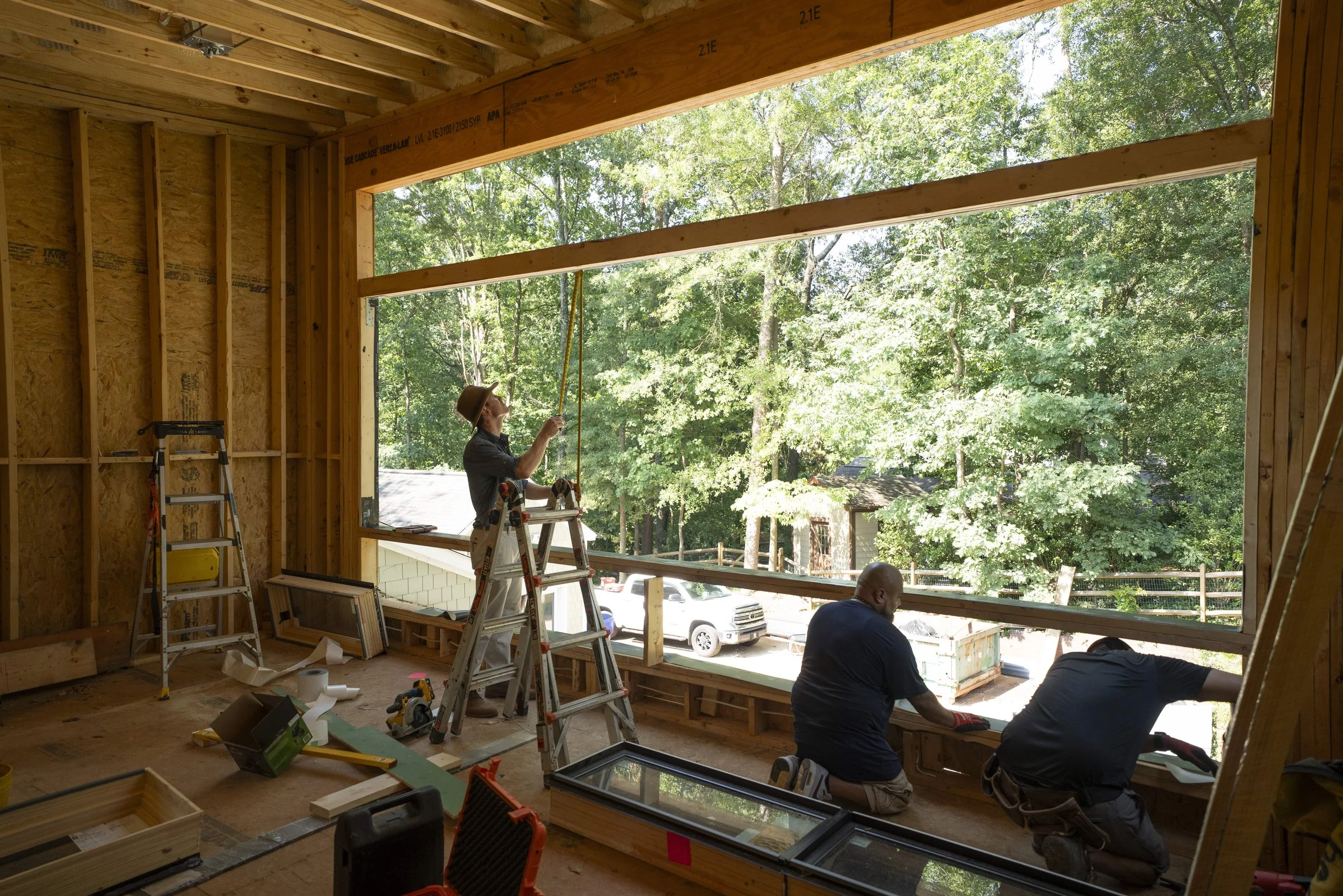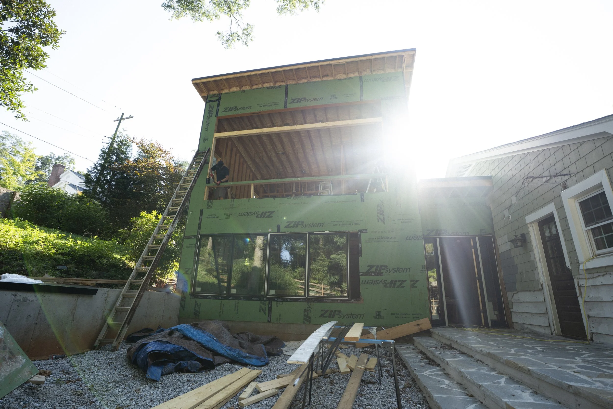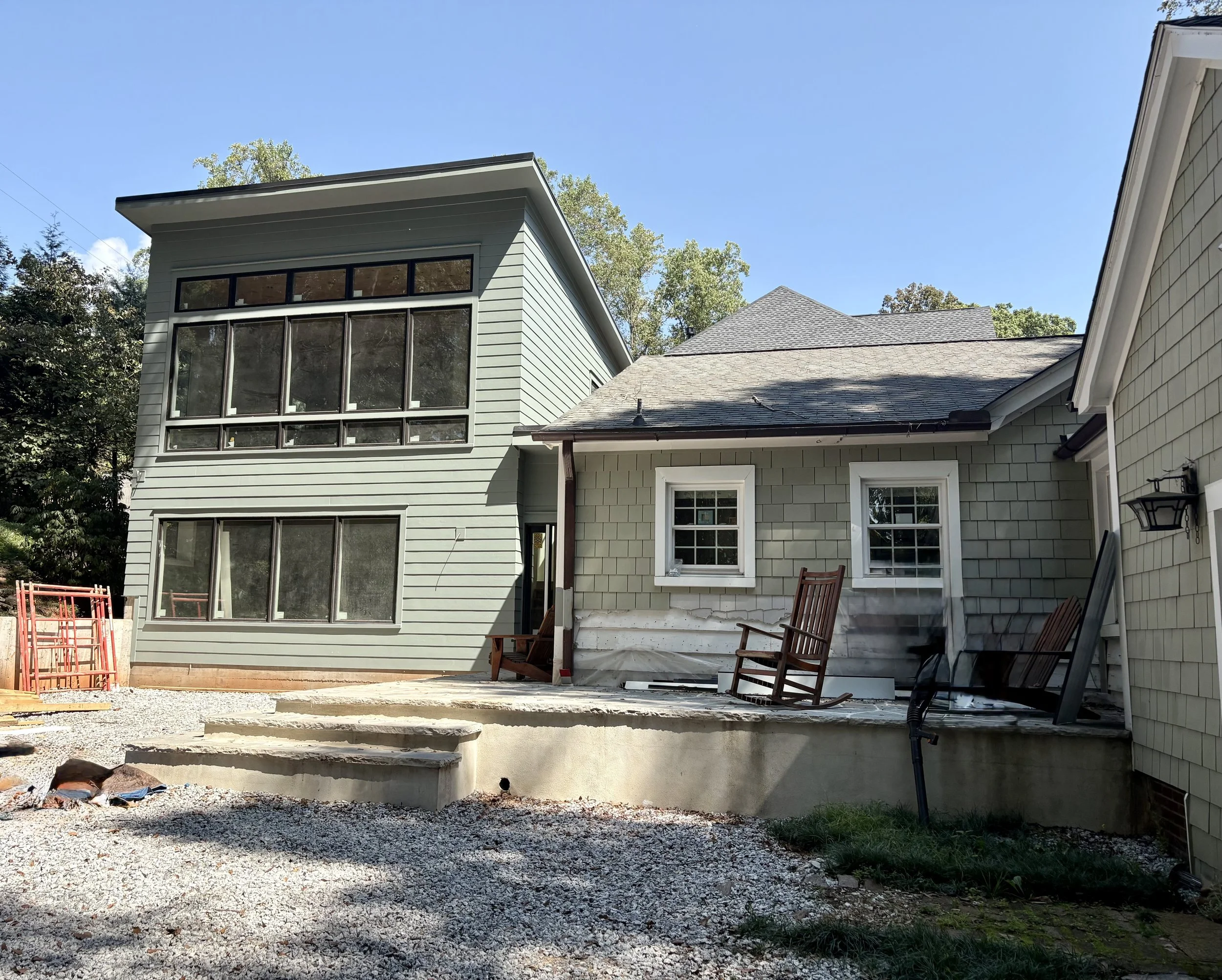 A master suite addition and kitchen renovation transformed this cozy cottage into an empty-nester paradise with a modern lean. The first phase of this renovation added a striking master suite wing that balances modern design with the original cottage charm. The “wall of windows” bring the outdoors in and allow the space to flood with natural light. The suite features a dramatic 20-foot vaulted post-and-beam ceiling, curated tile work, and a spa-style bathroom retreat. A true modern treehouse!